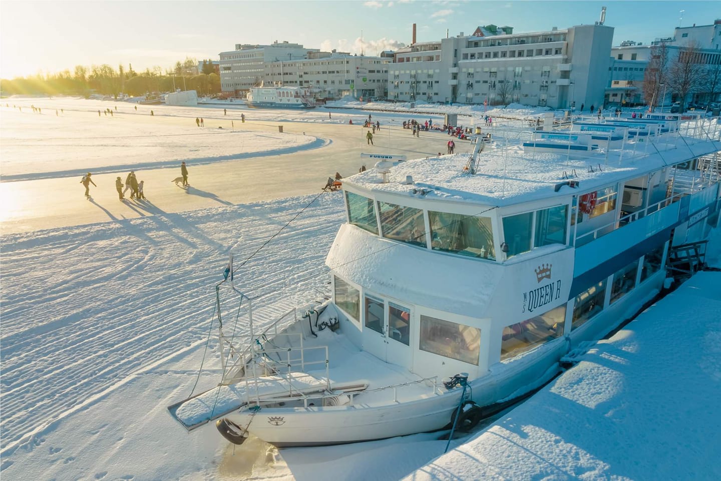 Tarjoamme talven harrastuksiin vuokravälineitä (retkiluistimia, potkureita, suksia) sekä kahvila- ja baaripalveluja m/s Queen R -laivalla, joka on talvisaikaan ankkuroitu tukevasti Kuopion Matkustajasatamaan, hiihtolatujen ja luistinradan äärelle.